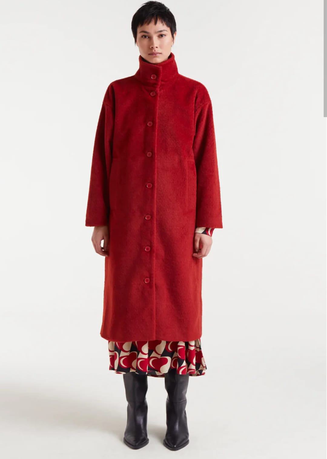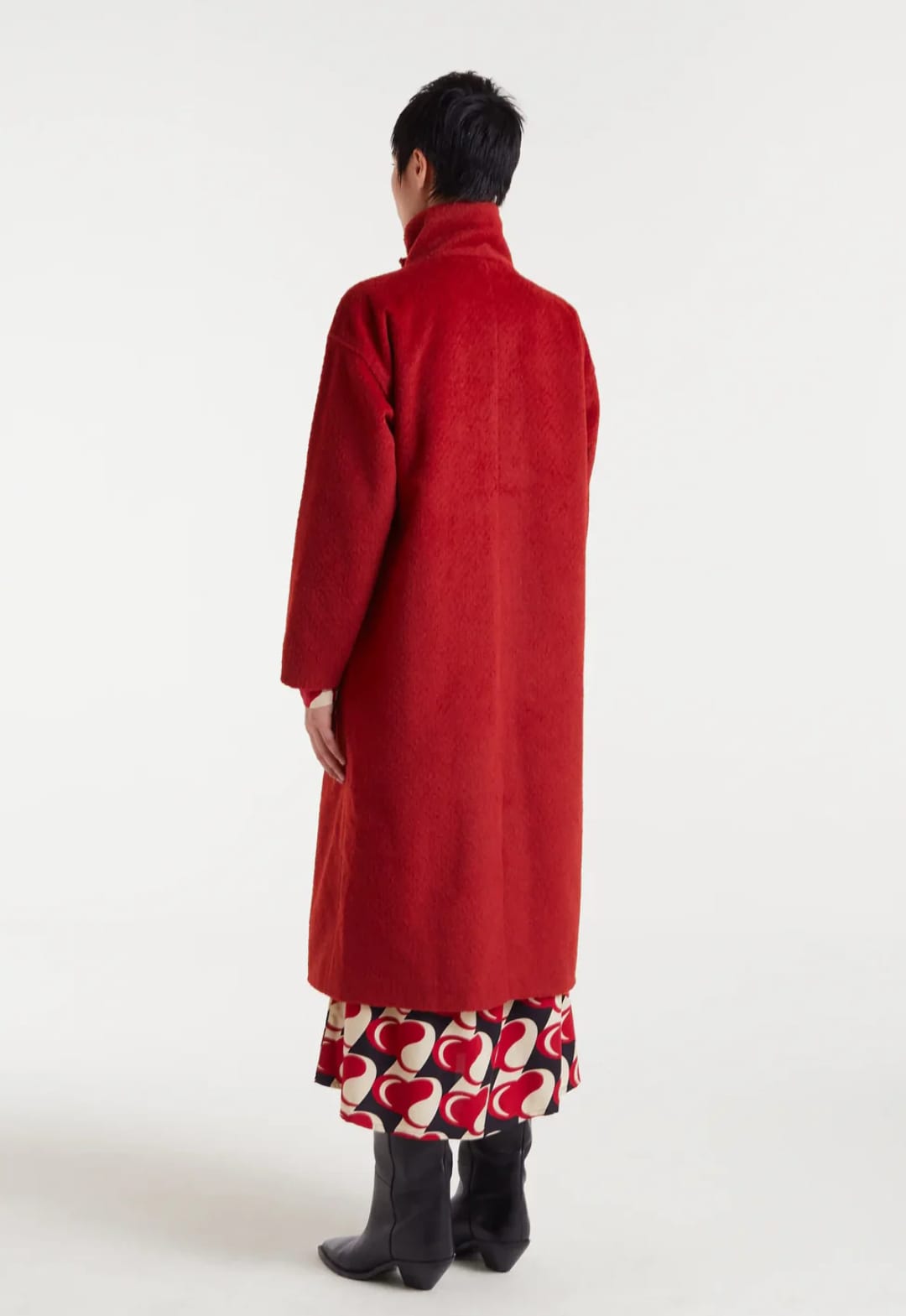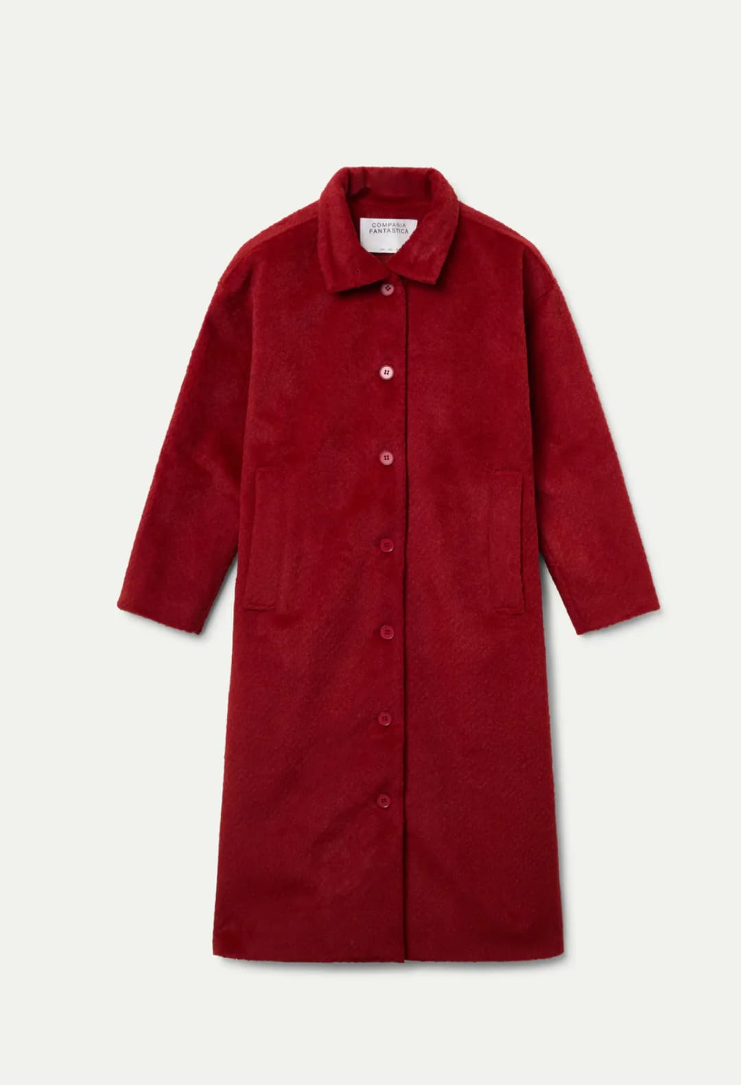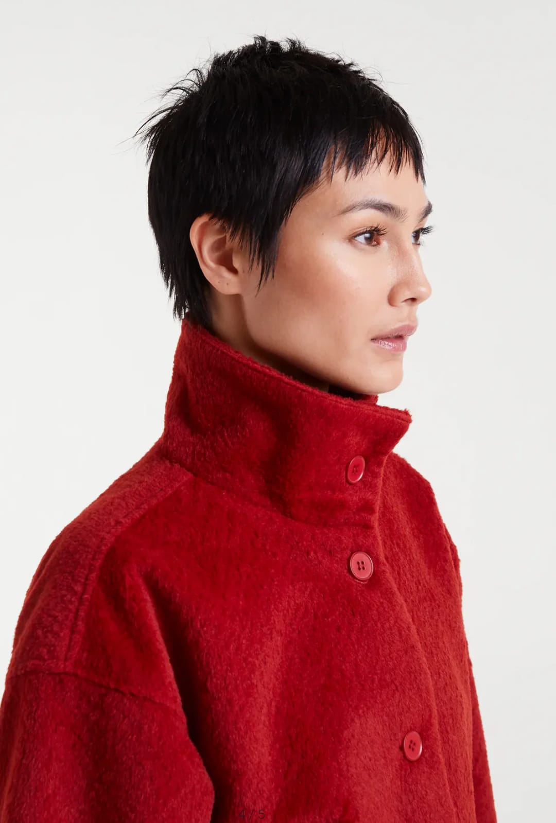 Abrigo largo con tejido efecto pelo corto de color rojo. Cuello solapa y manga larga. Cierre frontal con botones. Hombro ligeramente caído. Bolsillos frontales. Forro interior.