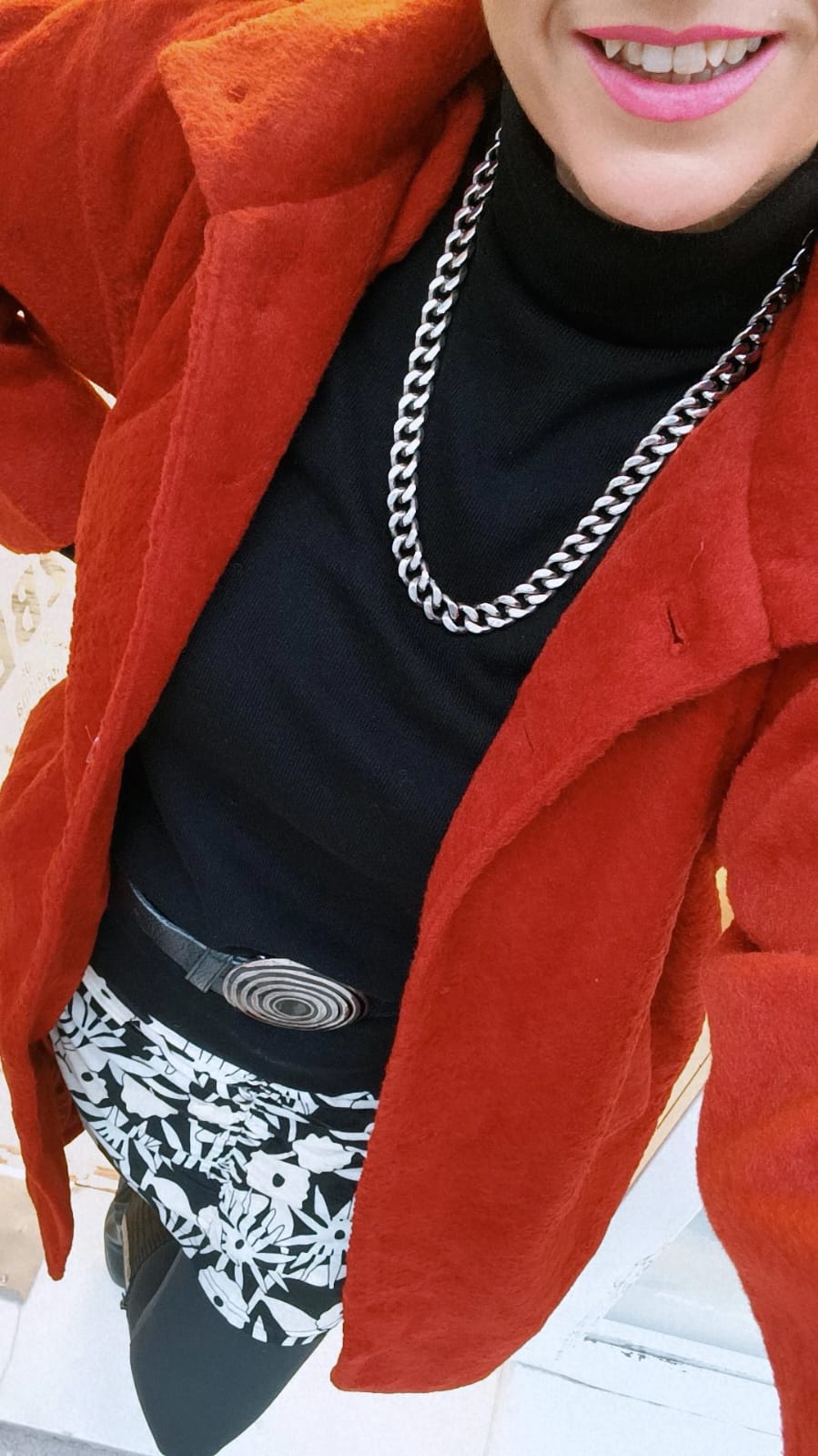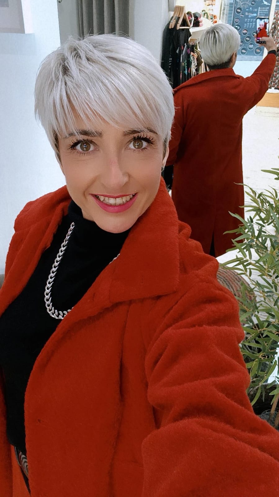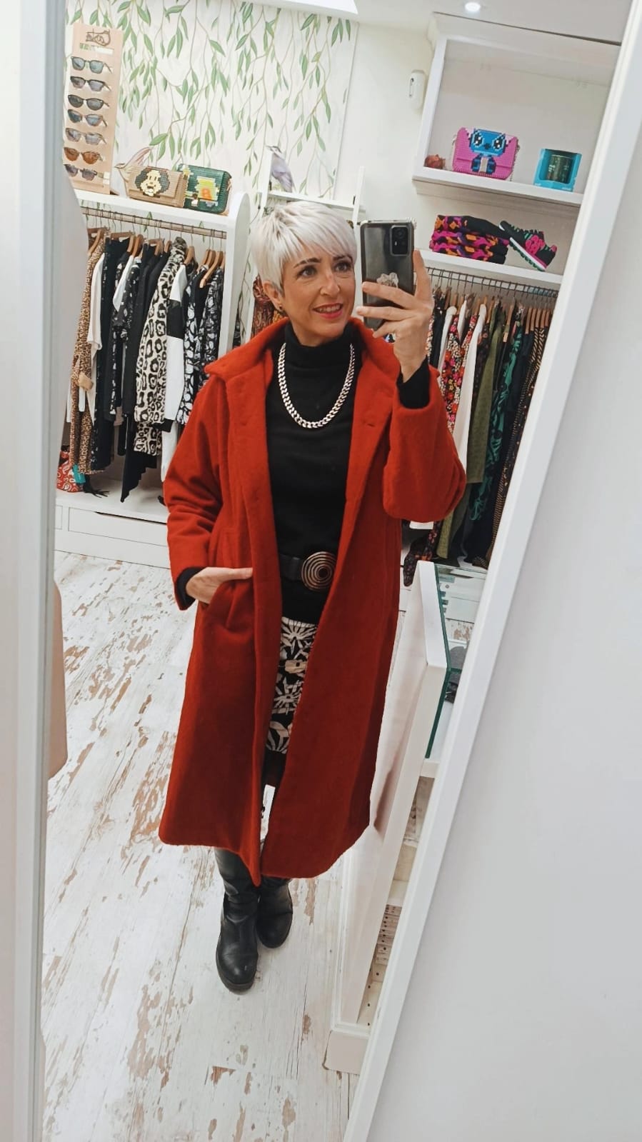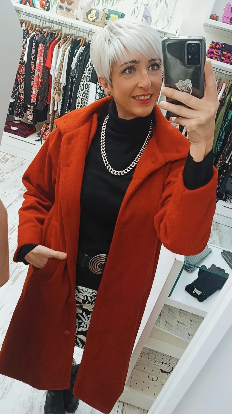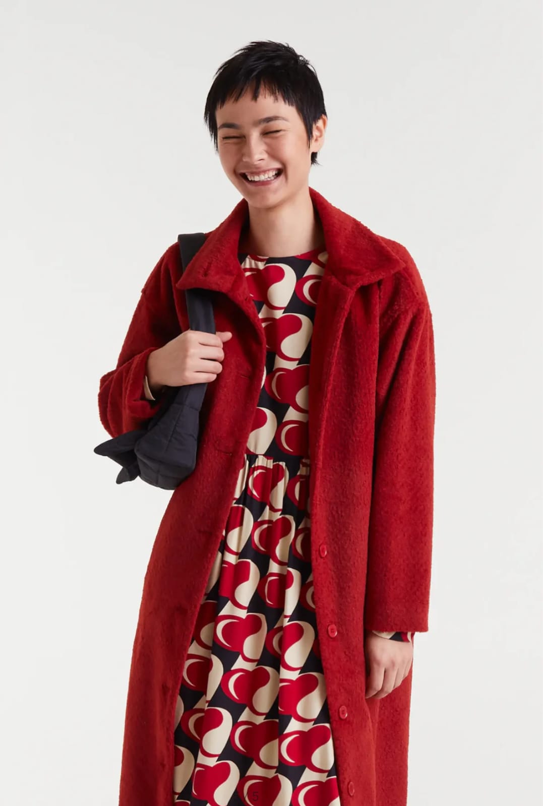 Abrigo largo con tejido efecto pelo corto de color rojo. Cuello solapa y manga larga. Cierre frontal con botones. Hombro ligeramente caído. Bolsillos frontales. Forro interior.