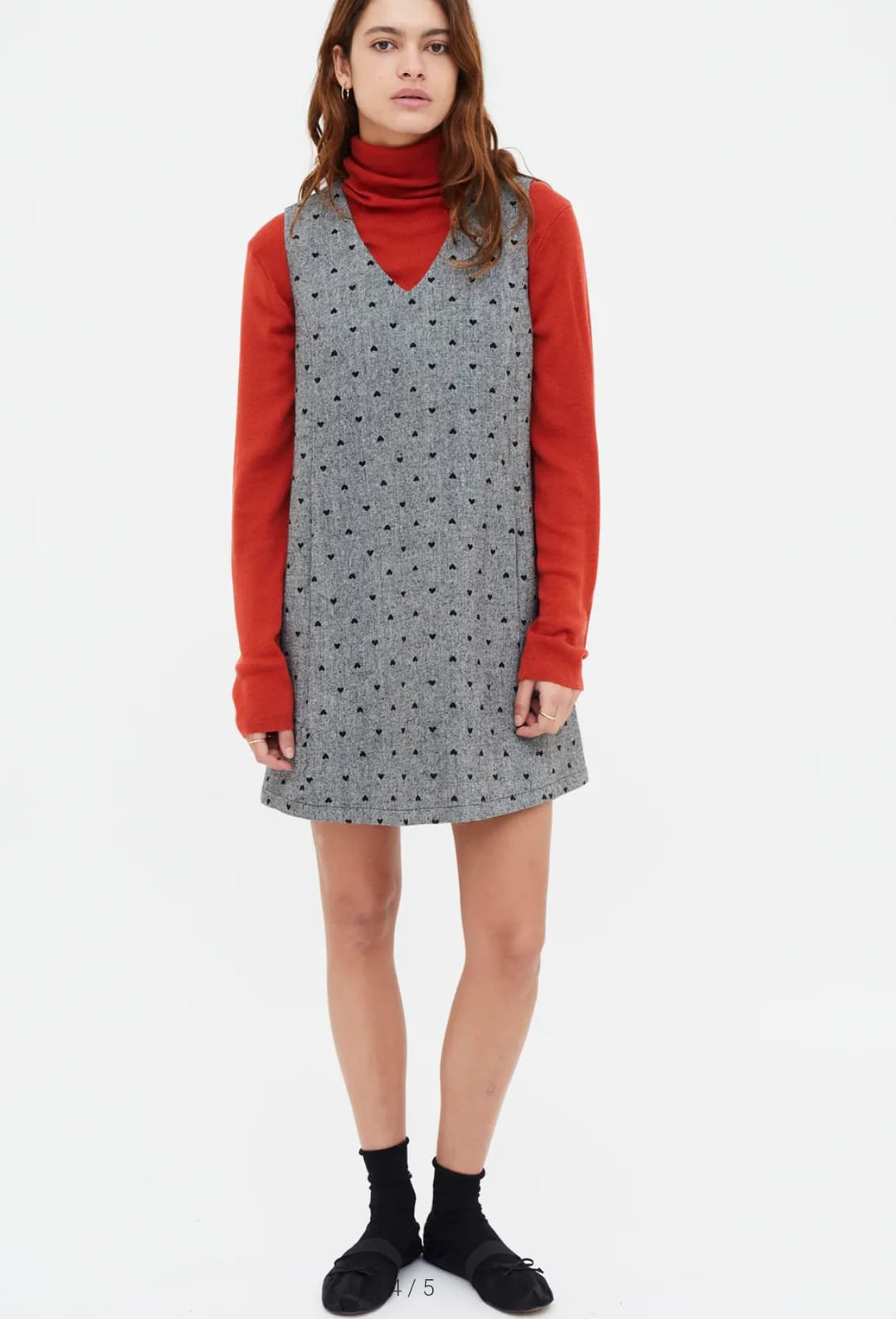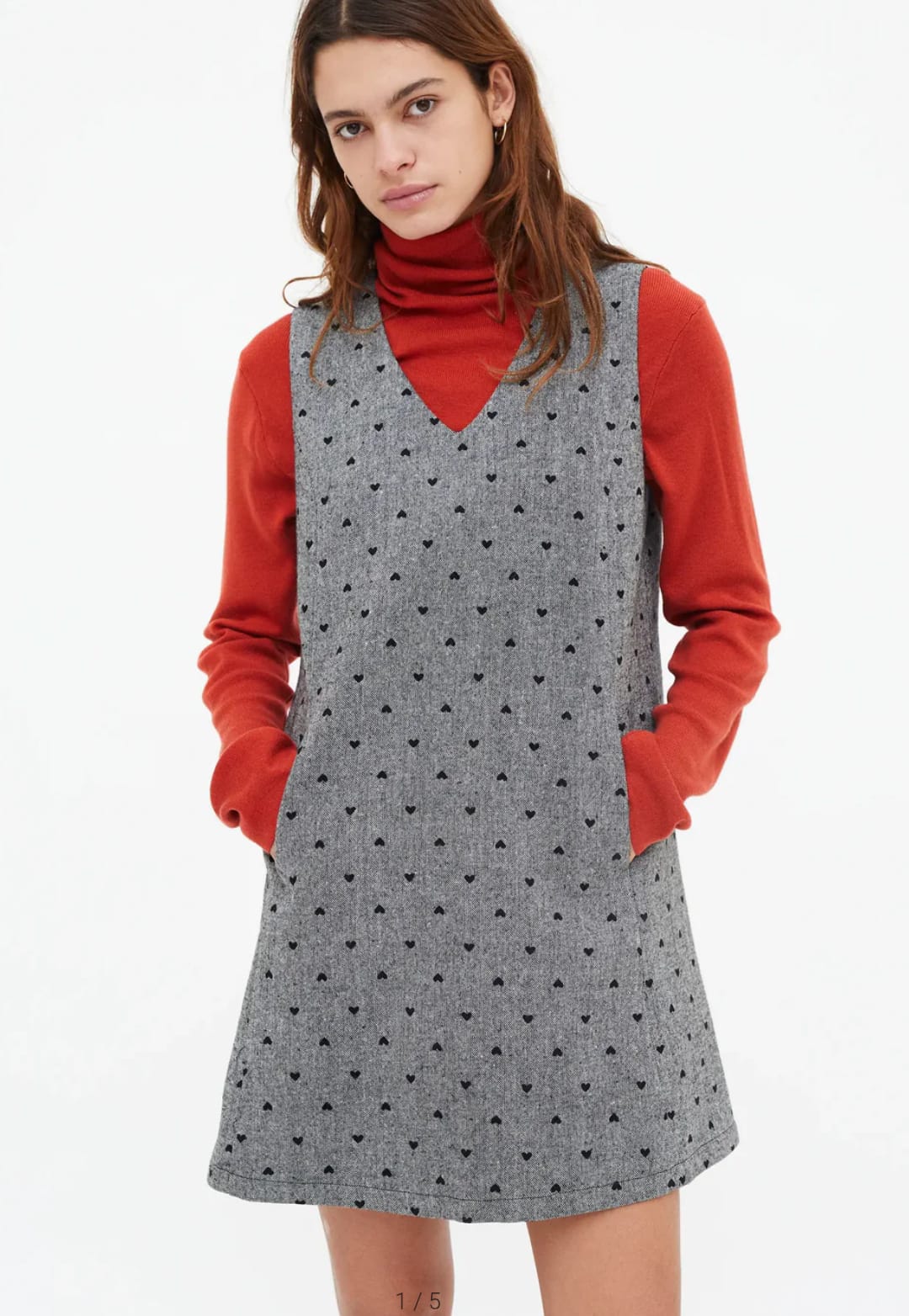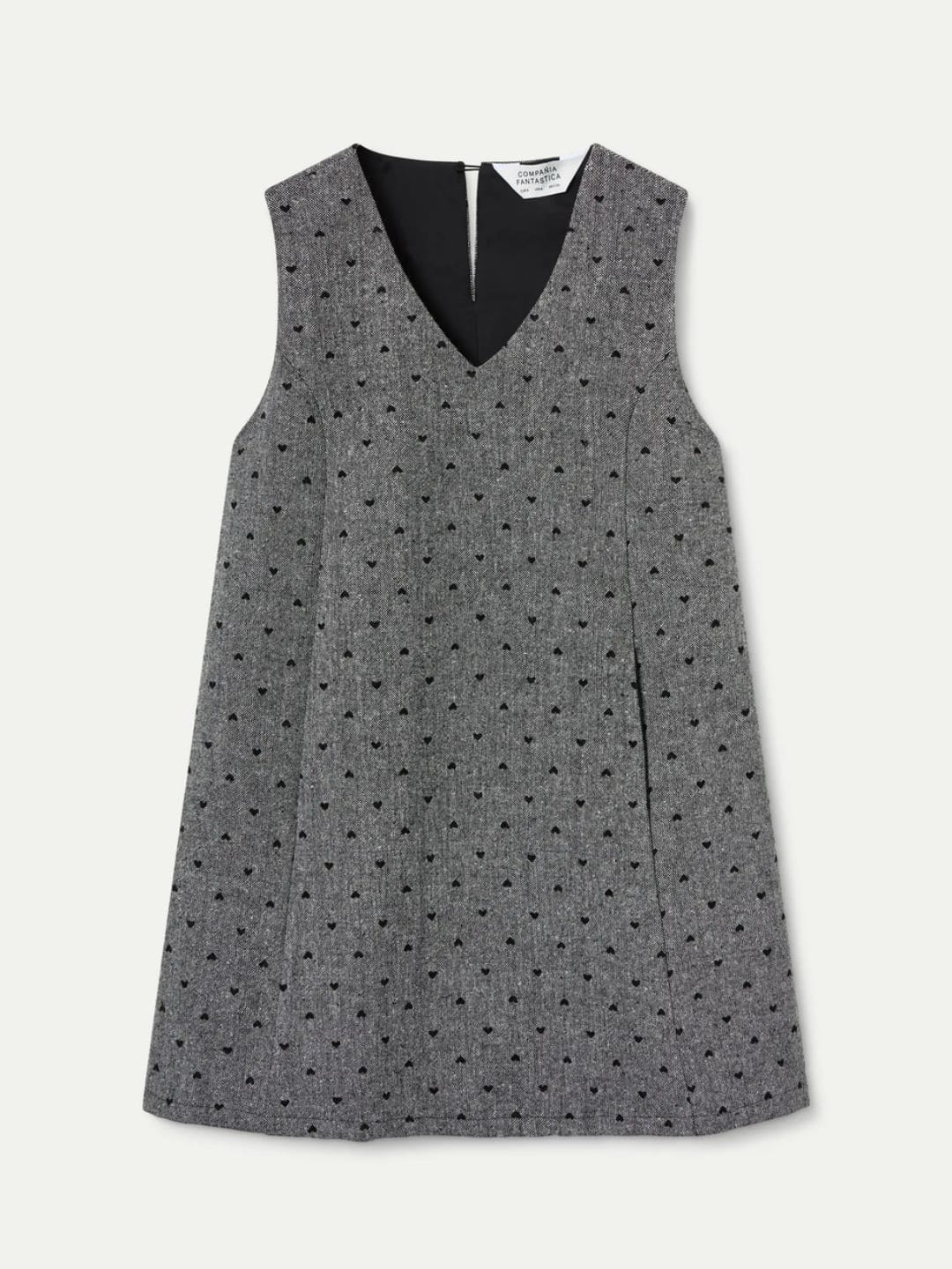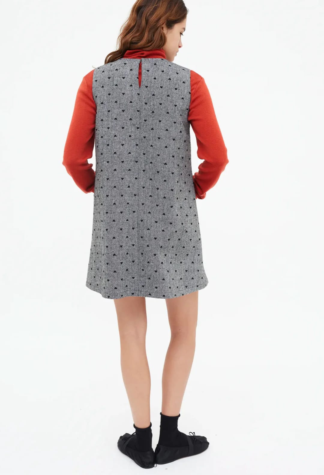 Vestido corto de tejido tweed con estampado de corazones de color negro. Con escote pico y sin mangas. Bolsillos frontales. Forro interior.